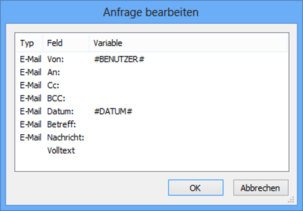 Dans la fenêtre Modifier la requête, vous trouvez la liste de tous les champs du masque de requête ou des masques de requête combinés. Les entrées d’un masque de requête s'affichent en tant que valeurs constantes dans la colonne Variable.