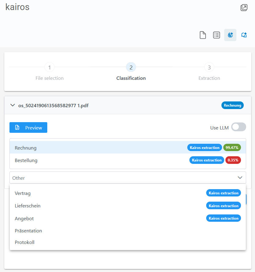 Index data can only be automatically extracted by enaio® kairos if a document type is tagged with Kairos extraction. You can use the Use LLM function for all document types (with and without the Kairos extraction tag).